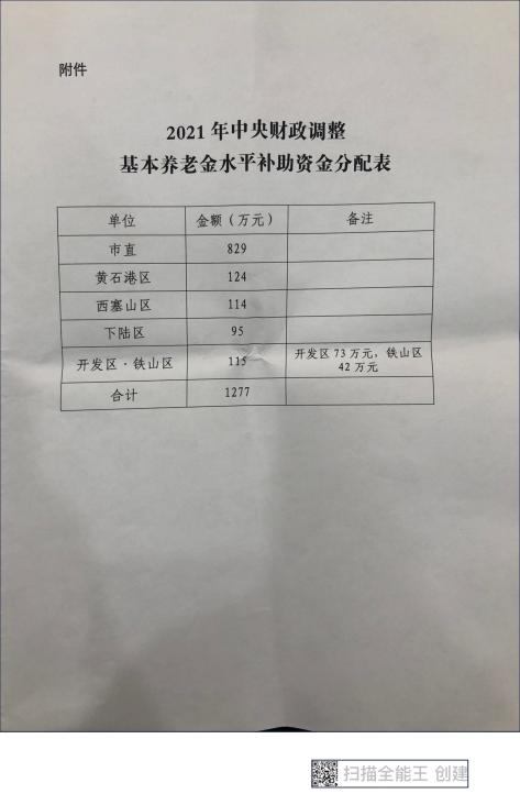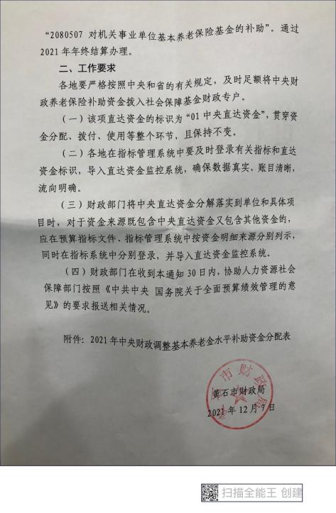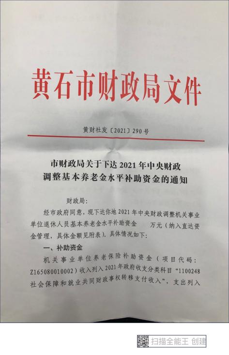 黄财社发【2021】290号市财政局关于下达2021年中央财政调整基本养老金水平补助资金的通知
