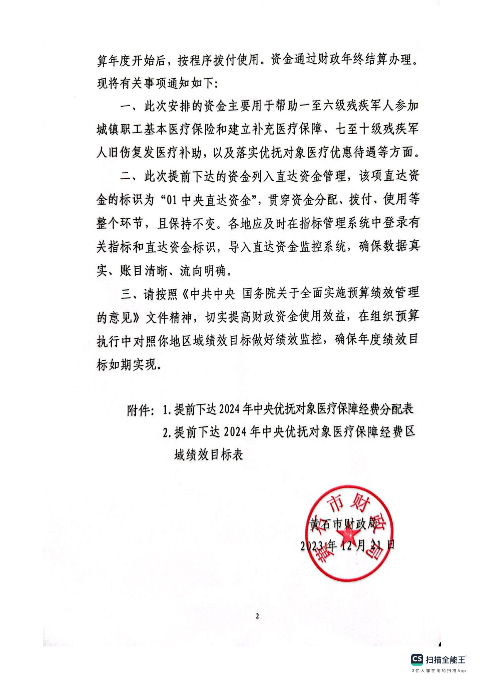 黄财社发【2023】311号黄石市财政局关于提前下达2024年中央优抚对象医疗保障经费的通知