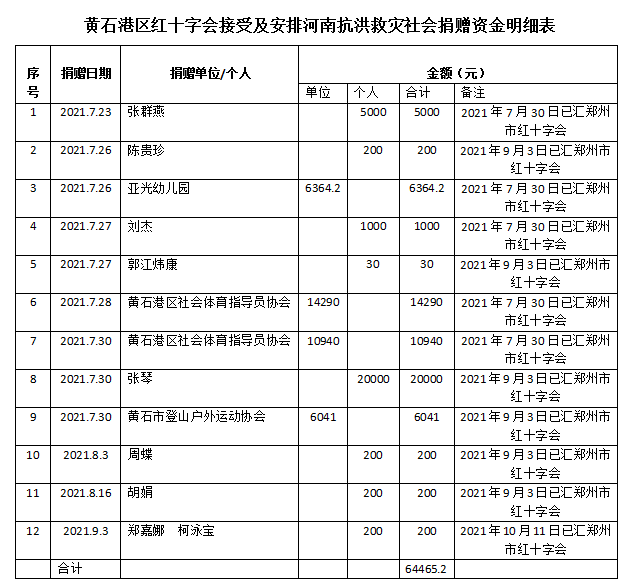 现将黄石港区红十字会接收及安排河南抗洪救灾社会捐赠明细公示如下: