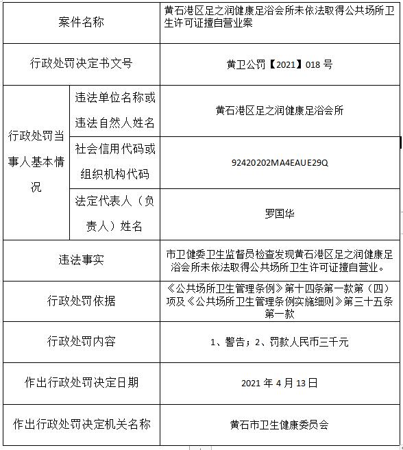 黄石港区足之润健康足浴会所未依法取得公共场所卫生许可证擅自营业案