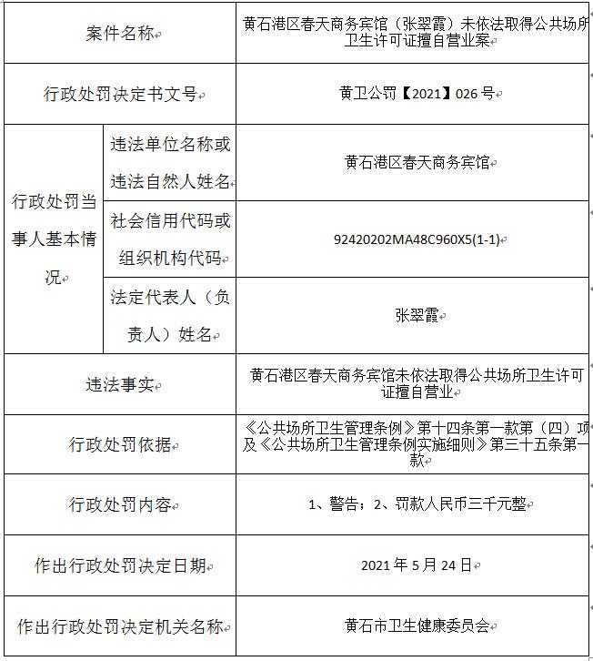 黄石港区春天商务宾馆(张翠霞)未依法取得公共场所卫生许可证擅自营业案