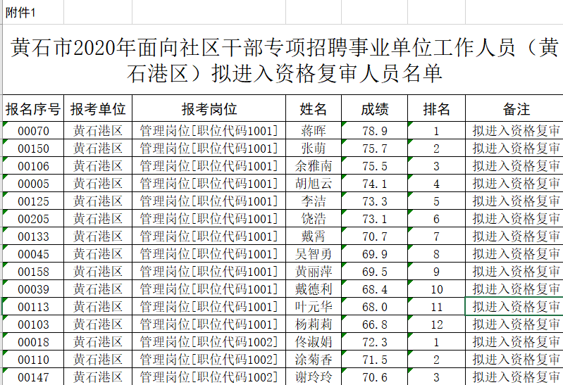 附件1:黄石市2020年面向社区干部专项招聘事业单位工作人员(黄石港区)拟进入资格复审人员名单