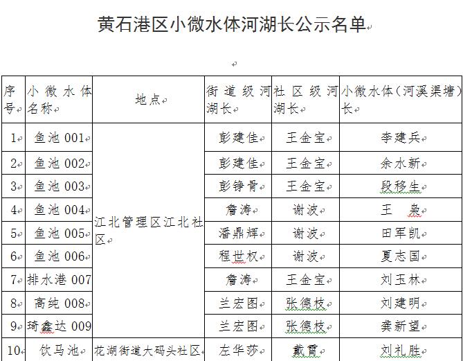 为贯彻落实省、市关于将小微水体实纳入河湖制管理的文件精神,按照区河湖长办印发的《在小微水体实施河湖长制的实施方案》(港河办[2019]13 号)的有关要求,现将我区小微水体河湖长名单公示。: