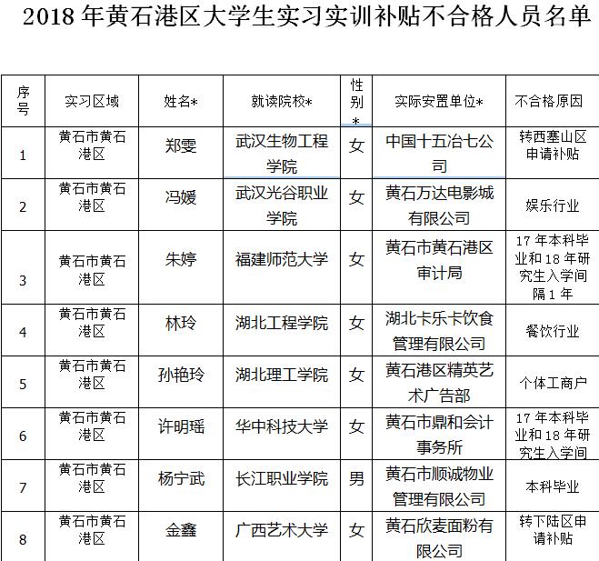2018年黄石港区大学生实习实训补贴不合格名单公示