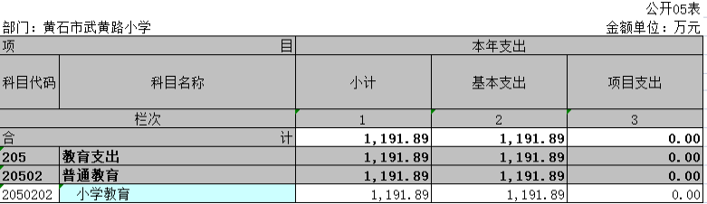 - 教育支出(类)普通教育(款)小学教育(项):年初预算为 499.45 万元,支出决算为 1191.89 万元,完成年初预算的 238.64 %,主要用于学校日常运行支出及武黄路小学改扩建(二期)动工。