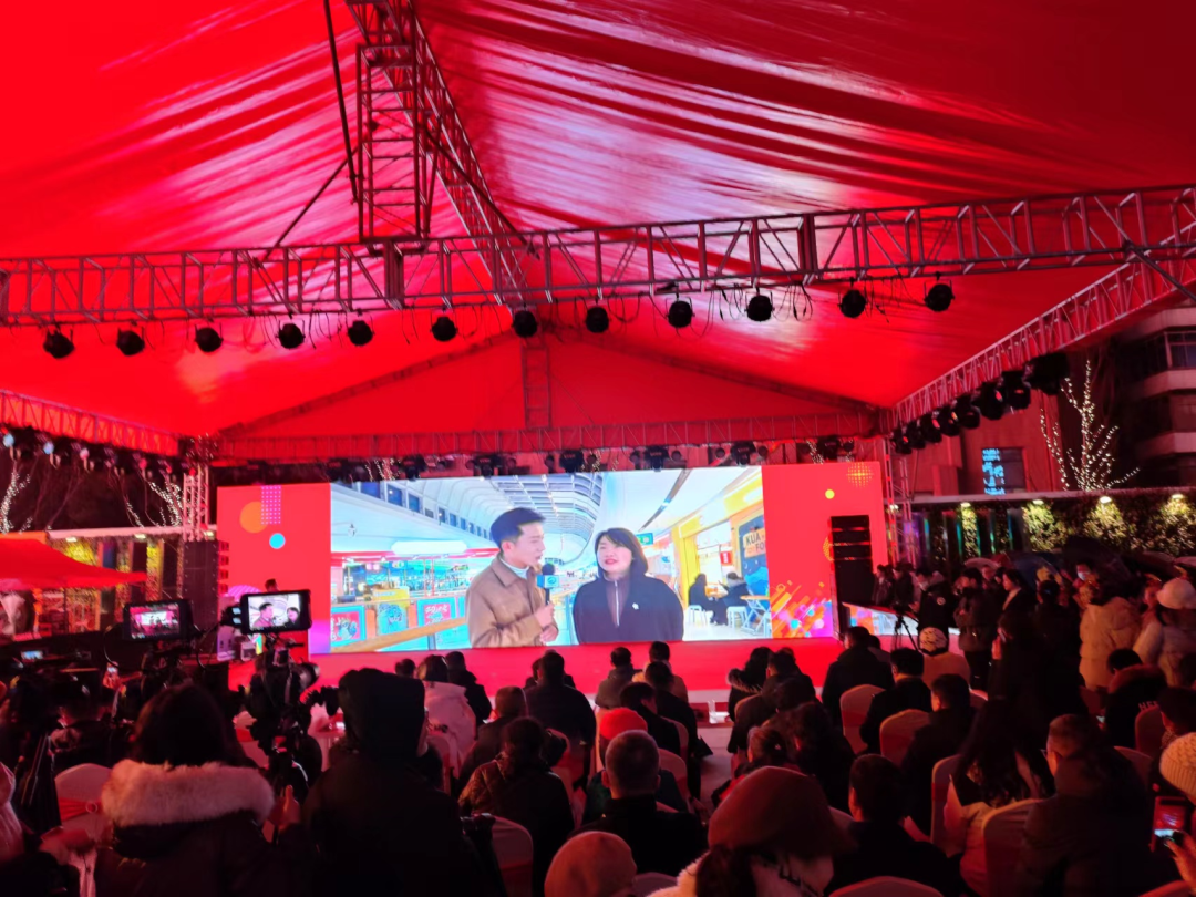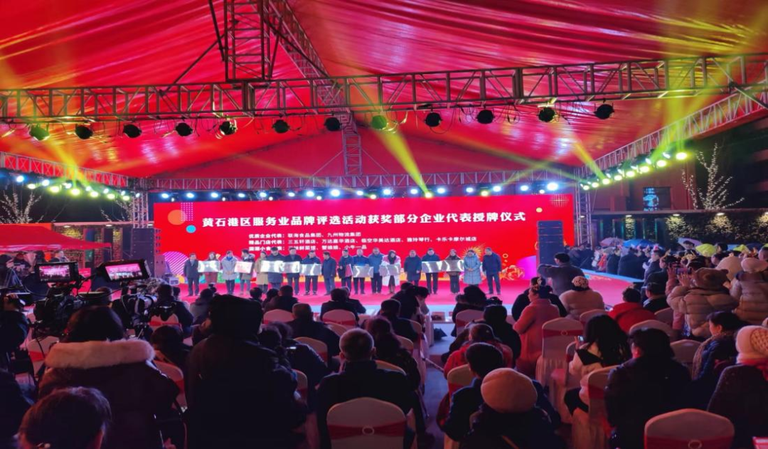 当晚,开幕式首次开设直播间,采取抖音线上刷话题抽奖方式吸引关注。主会场现场人头攒动,热闹非凡。启动仪式以热烈的开场舞拉开序幕,现场连线万达、华新1907、摩尔城等分会场活动情况,与会领导共同为黄石港区首届商贸服务业评选活动中评选出的“优质企业家”“精品门店”“国潮小吃”代表以及交通路步行街、钟楼烟火美食街等2家商贸分会进行授牌,向外界传递黄石港区商贸服务业的实力和特色。