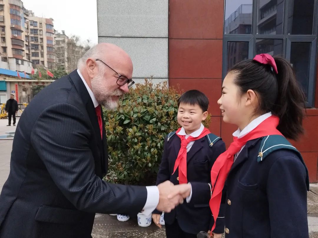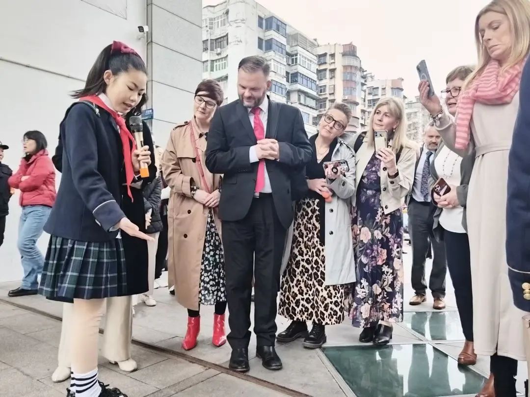 “让每个儿童和青少年都能快乐学习并取得成功。”英国北爱尔兰教育部基础教育厅学校援助官员和校长们将这一教育理念带到了中国,他们俯下身子认真倾听小讲解员的讲解,不时竖起大拇指称赞,还与学生亲切握手,在这堂生动的赏识教育课中,每一个学生都“闪闪发光”。