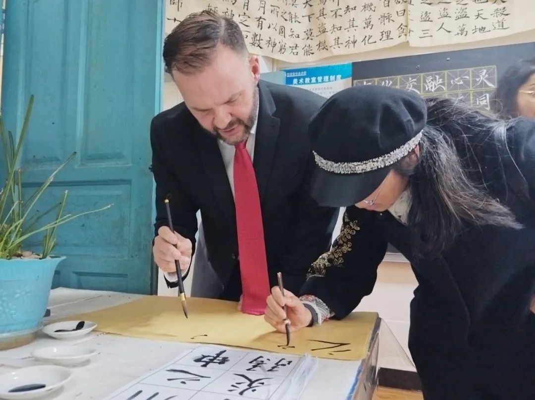 书法和国画是中华民族的艺术瑰宝。代表团每位成员在“小老师”的带领下,端坐在课桌前,他们拿起毛笔,一笔一画学写中国字和中国画,那股认真的态度和精神,令人动容。舞蹈社团学生表演的歌舞《忆长安》,灵动唯美,气势恢宏。京剧社团展示的曲目《卖水》,“小花旦”惊艳出场,唱腔纯正。邀请代表团成员上台“变装”,穿上京剧角色的“行头”,轻甩长袖,成为本次活动的亮点,获得点赞和掌声。