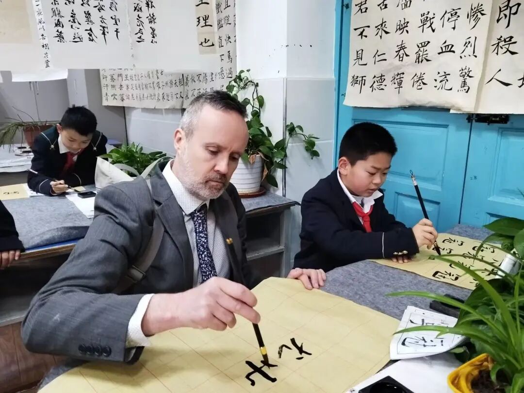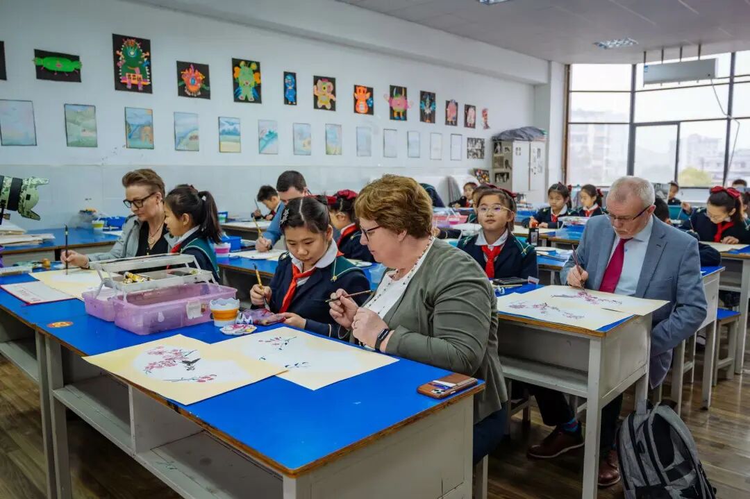 沿着一条装饰着孔雀石、紫水晶等矿冶文化元素的“晶彩”之路进入中山小学校园,英国北爱尔兰代表团(以下简称代表团)一行参观了中山小学非遗工作坊、创客中心、红领巾电视台等,体验了中国书法、国画、版画等,一个个动人瞬间、一段段精彩时刻,在文化交流中闪耀着情感交融的光芒。校园内,学科特色作业、多彩社团手工展区吸引了代表团一行。生肖灯笼、非遗漆扇、剪纸、扎染和纸塑,绽放非遗里的“指尖”艺术。每到一处,大家纷纷拿起手机拍照片和视频,赞叹不已。大课间,操场上,学生展示的校本武术操,一招一式,刚柔并济,展现中华武术的精气神,震撼全场。体育课上,学生踢足球、打篮球,活力满满,尽情地享受运动带来的快乐。代表团成员、英国北爱尔兰坦普帕特里克小学副校长斯蒂芬•克罗泽走上足球场秀了一把球技,他一边说着英语,一边比划着自己的右脚,与学生分享踢足球的小技巧。值得一提的是,长廊下的教师粉笔字展区,每块小黑板上的《春晓》《咏柳》等经典古诗词书写不仅工整美观,还配上精美的手绘图,汉字的形态美、结构美,在生动形象的情境里,诠释了博大精深的中华文化,引得代表团成员纷纷驻足拍照。当天,恰逢每周语文学科教研活动日,朱知慧名师工作室吴蔚、曹春花等成员围绕主题“走进奇妙的童话天地 感受童话创编魅力”展开讨论和分享。看到这一幕,英国北爱尔兰教育部基础教育厅学校援助官员德里克•哈克尼斯用英语提问道,“他们每周都这样么?”得到肯定的回答后,他表示,高质量的教学是推动教育进步的核心,以提高教育质量为核心,才能促进学校内涵发展。