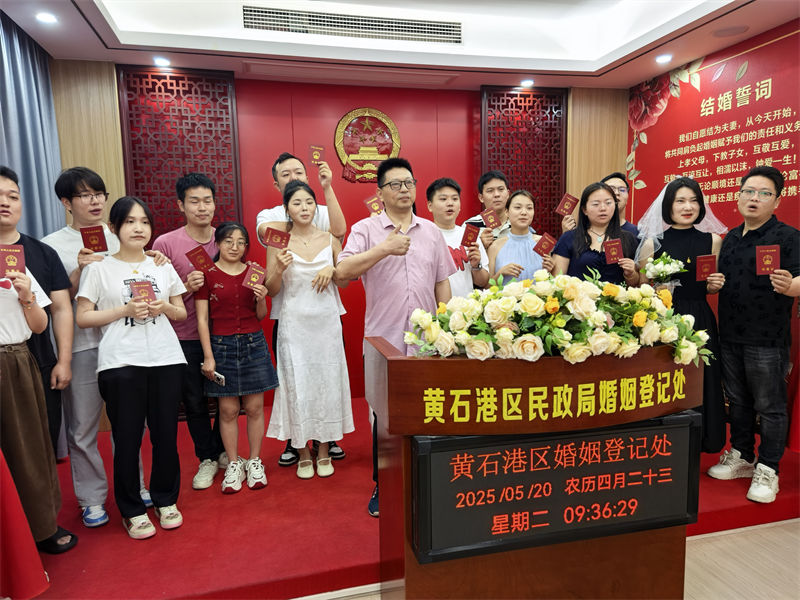 为进一步弘扬时代新风、倡导树立新型婚俗观念,5月20日,区民政局举办“爱在黄石港 情定520”主题婚姻登记集体颁证仪式。
