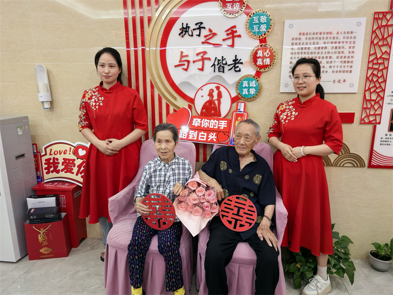 活动还邀请一对80多岁的金婚夫妻到场,见证新人的幸福,老人向新人们寄语,希望他们在未来的日子相亲相爱,相互体谅,白头偕老。
