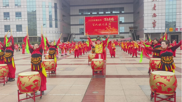 活动当日,2026年黄石市“万马奔腾”百人快闪展演在黄石港区工人文化宫热闹上演,110名演员同台献艺,用一场气势恢宏的民俗表演,为元宵佳节增添浓浓喜庆氛围。