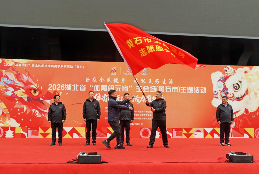 活动现场,市人民政府副秘书长胡雄向黄石市全民健身志愿服务队授旗,省体育局群体处二级调研员胡伟宣布2026湖北省“体育闹元宵”主会场(黄石市)主题活动正式启动。