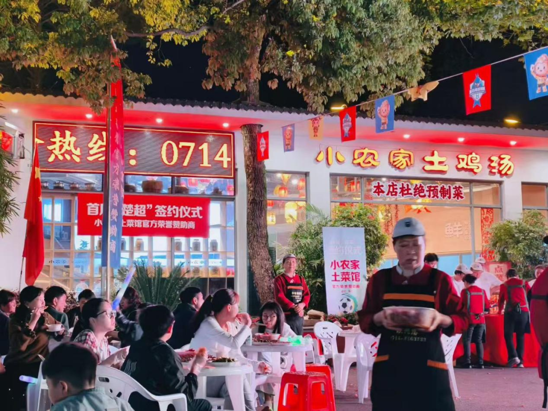 当揭幕战正式打响,小农家菜馆的观赛点爆发出巨大的声浪——“射门!”“好球!”还有现场主持人带着大家玩起比分竞猜、球迷互动游戏。