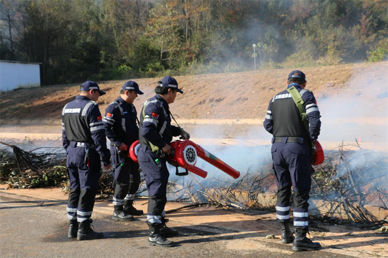 在当天举行的2023年森林防灭火应急演中,3支救援队伍共60人参与演练,主要采取“以水灭火”的方式。演练现场,设置大量草料等可燃物模拟森林起火,起火后,无人机空投灭火弹,3支队伍共同采取水泵“以水灭火”协同作战方式到指定的火点展开扑救,成功扑灭火焰。此次演练检验了我区半专业队伍“以水灭火”能力,推进“以水灭火”能力建设。