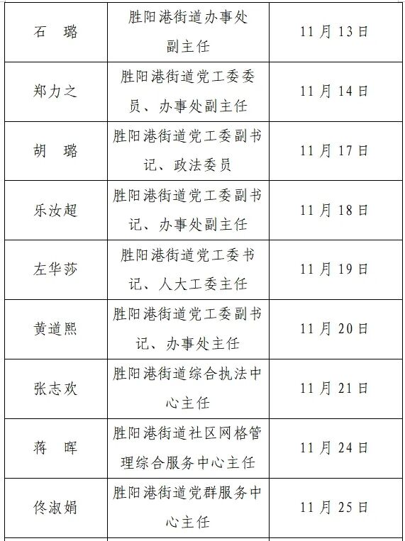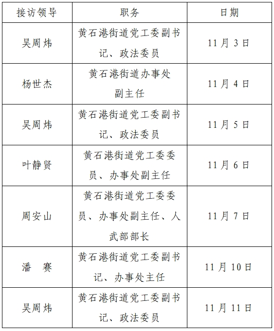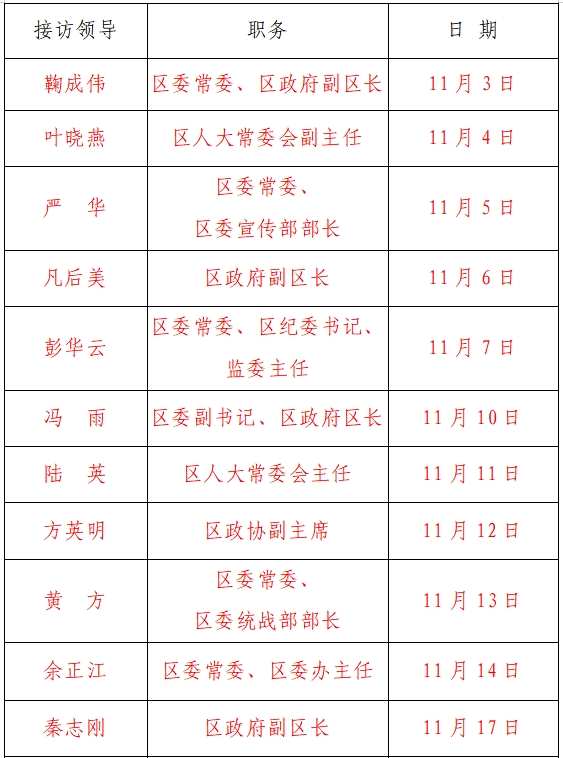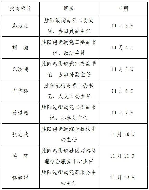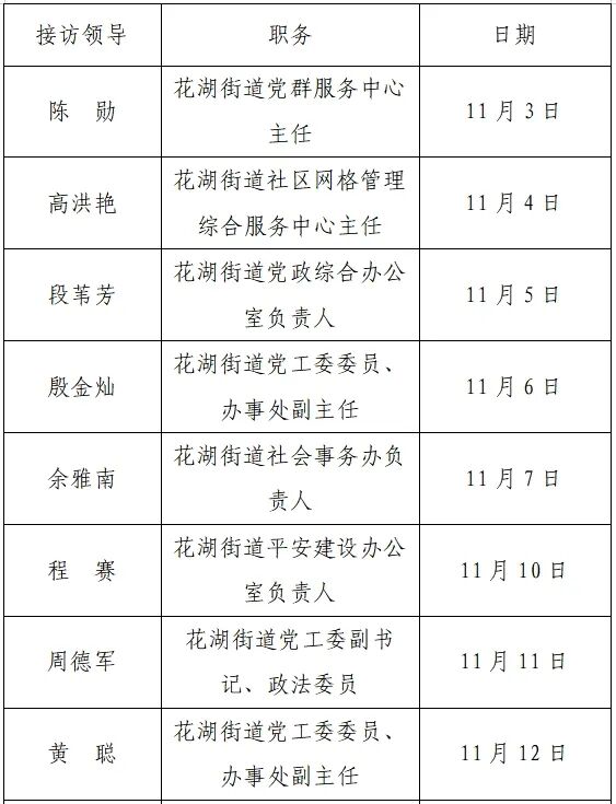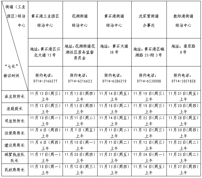 为深入推进平安建设,提升基层社会治理现代化水平,充分发挥综治中心及时为群众解决难办问题的枢纽作用,根据工作安排,现将11月区、街道两级领导、“七长”入驻综治中心接访有关事项公告如下: