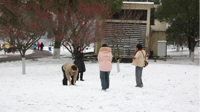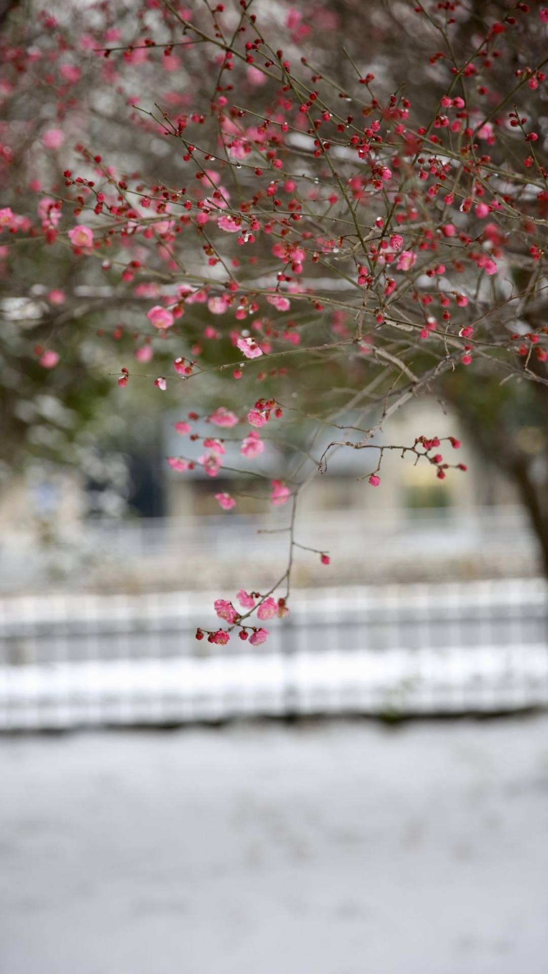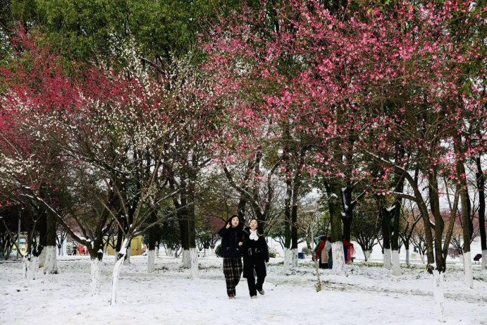 而在昨天,一场温柔飘落的冰雪,为它们换上了另一身衣裳——枝头覆上薄薄银装,花瓣托着晶莹雪粒,红梅愈艳,白梅愈清,暗香在清冽的空气里幽幽浮动,美得不似人间。