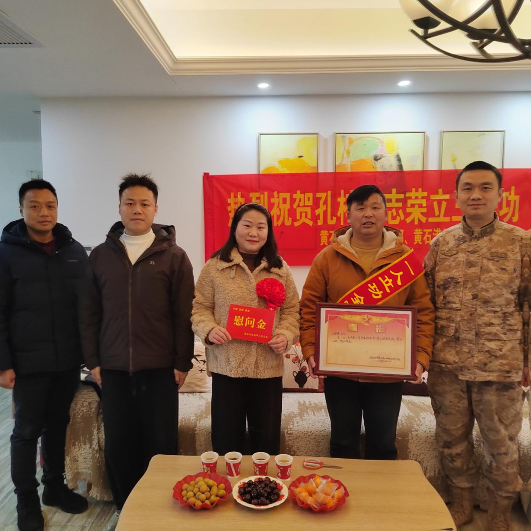 喜讯连连、荣光满溢。弘扬拥军优属、拥政爱民优良传统,营造“一人参军、全家光荣,一人立功、全社会敬仰”的浓厚氛围,近日,黄石港区退役军人事务局联合区人民武装部精心组织集中送喜报活动,12名荣立三等功、三级表彰的现役军人家庭,上门送上立功喜报、慰问金及新春祝福。