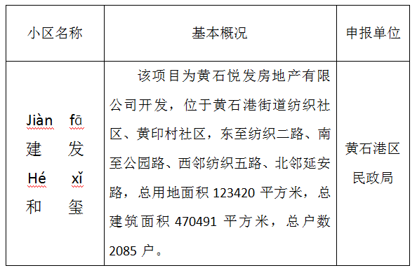 根据国务院《地名管理条例》、民政部《地名管理条例实施细则》和《黄石市地名管理实施细则》等有关规定,为切实做好黄石市地名工作,经审核,现将“建发和玺”地名予以公示,敬请广大市民提出宝贵意见和建议。