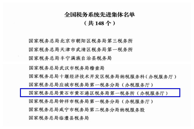 近日,人力资源社会保障部、国家税务总局对全国先进集体予以表彰,其中,黄石港区税务局第一税务所(办税服务厅)荣获“全国税务系统先进集体”荣誉称号,激励着区局全体干部职工锐意进取、实干担当。