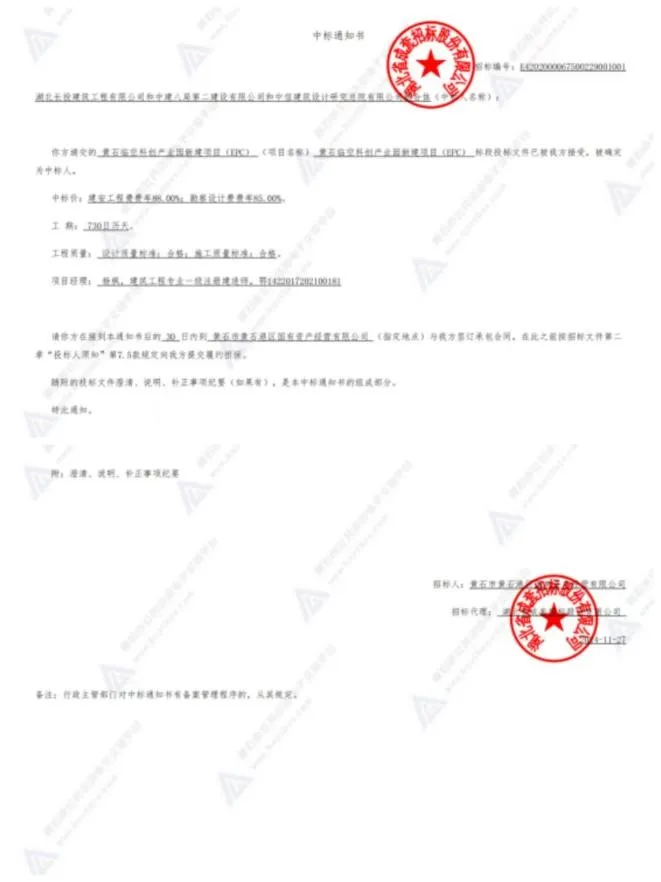 近日,区国有资产经营有限公司发出中标通知书,湖北长投建筑工程有限公司、中建八局第二建设有限公司和中信建筑设计研究总院有限公司EPC联合体,成功中标黄石临空科创产业园新建项目,中标金额约2.3亿元。