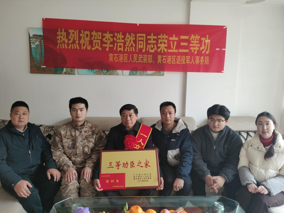 2月21日,黄石港区武装部、区退役军人事务局一行来到金水湾小区,为荣立“三等功”的现役军人李浩然家属送上喜报和慰问金,并向他们表示热烈祝贺。