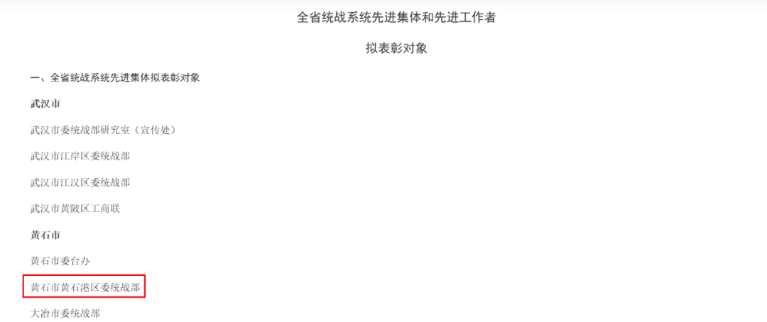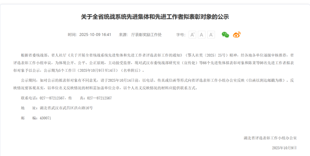 10月9日,湖北省人社厅发布《关于全省统战系统先进集体和先进工作者拟表彰对象的公示》,拟对66个先进集体和98名先进工作者进行表彰。