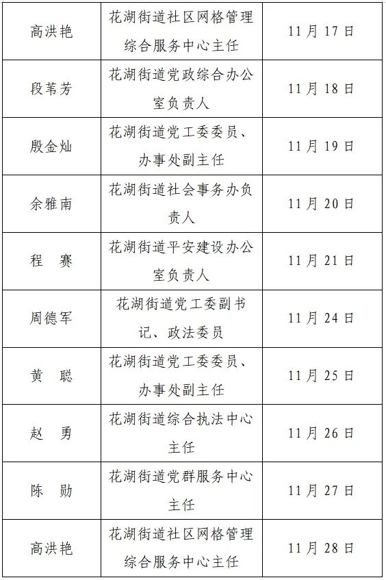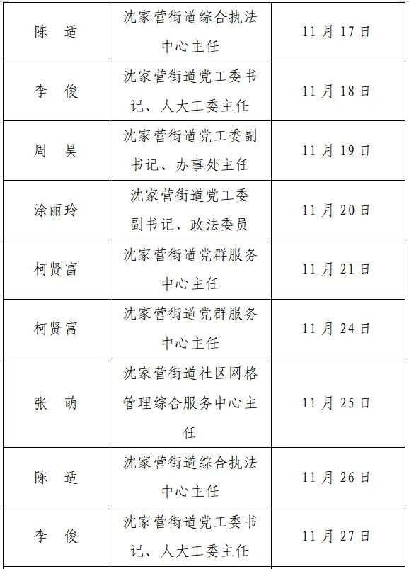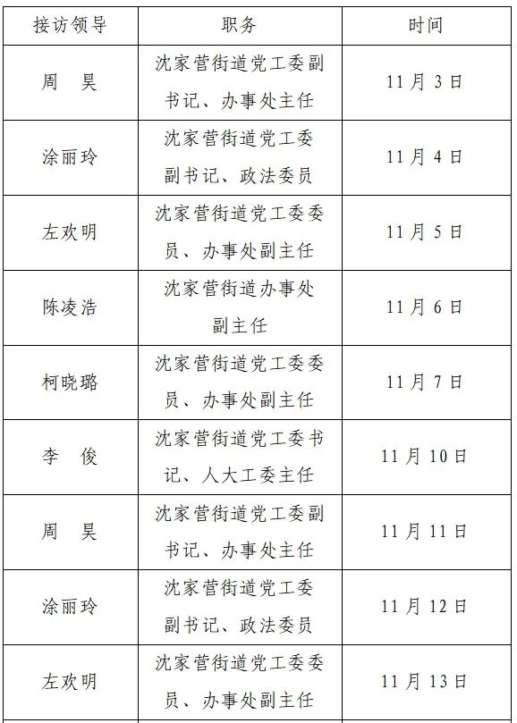 为深入推进平安建设,提升基层社会治理现代化水平,充分发挥综治中心及时为群众解决难办问题的枢纽作用,根据工作安排,现将11月区、街道两级领导、“七长”入驻综治中心接访有关事项公告如下: