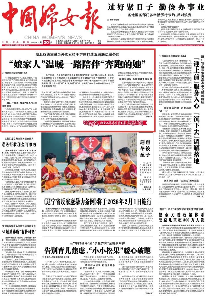 12月20日,《中国妇女报》头版头条刊发《湖北各级妇联为外卖女骑手群体打造五级联动服务网——“娘家人”温暖一路陪伴“奔跑的她”》一文,专题报道湖北妇联组织全力推进新兴领域妇联组织建设工作。其中,以我区优化小区门禁事例,宣传我区推动“痛点”问题闭环解决情况。