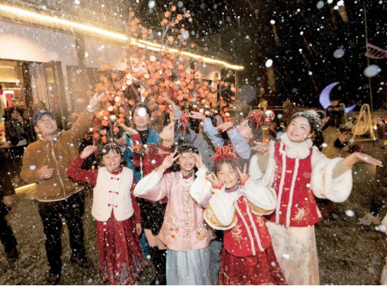 磁湖畔情人路的国风小院漫天飞舞的人造雪,为年轻人制造了浪漫惊喜