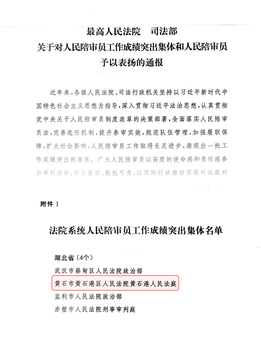 近日,最高人民法院、司法部发布《关于对人民陪审员工作成绩突出集体和人民陪审员予以表扬的通报》。黄石港区人民法院黄石港人民法庭获评“法院系统人民陪审员工作成绩突出集体”。