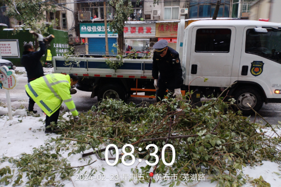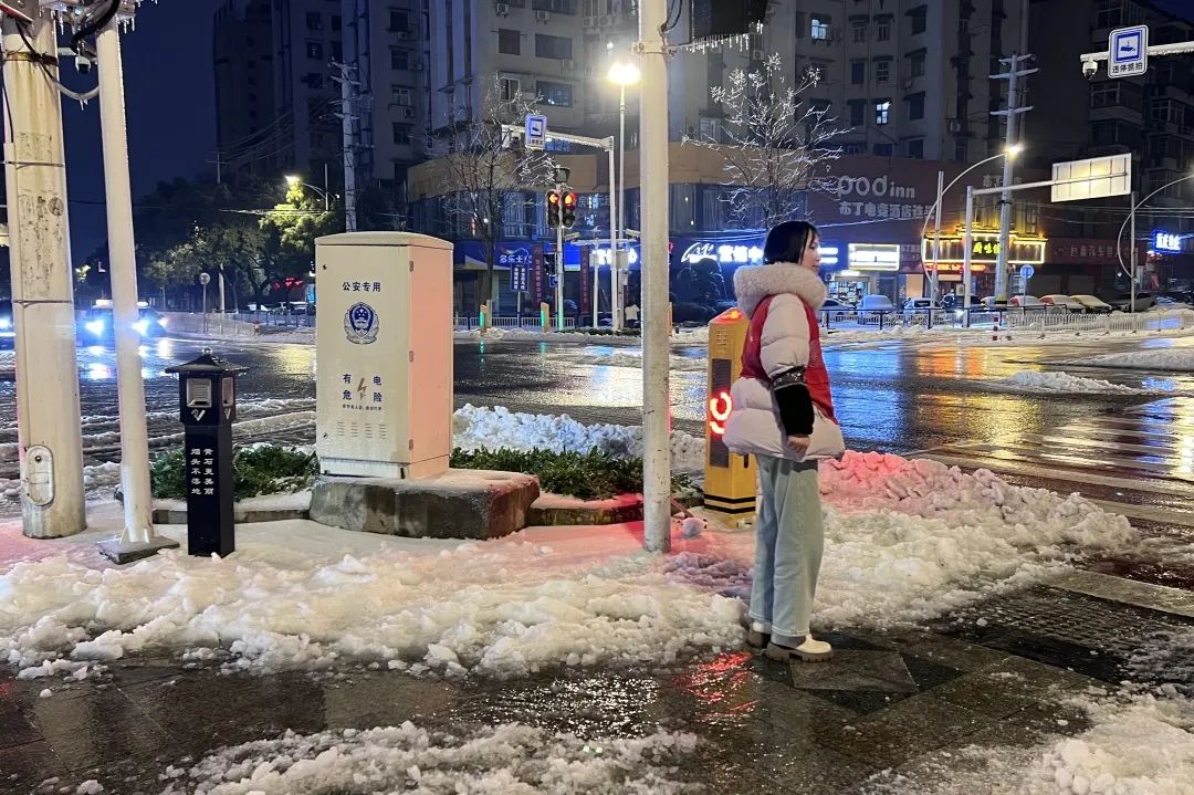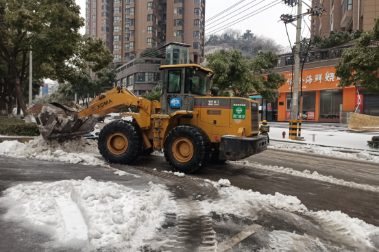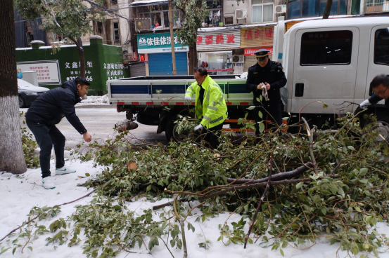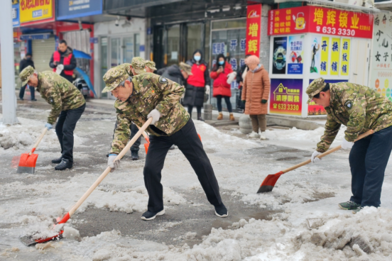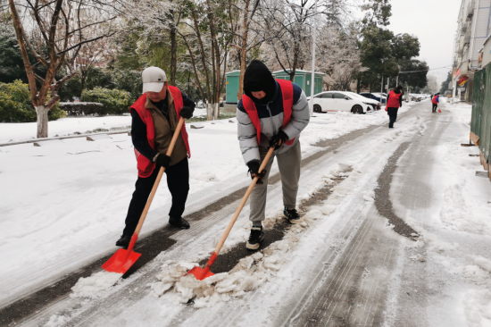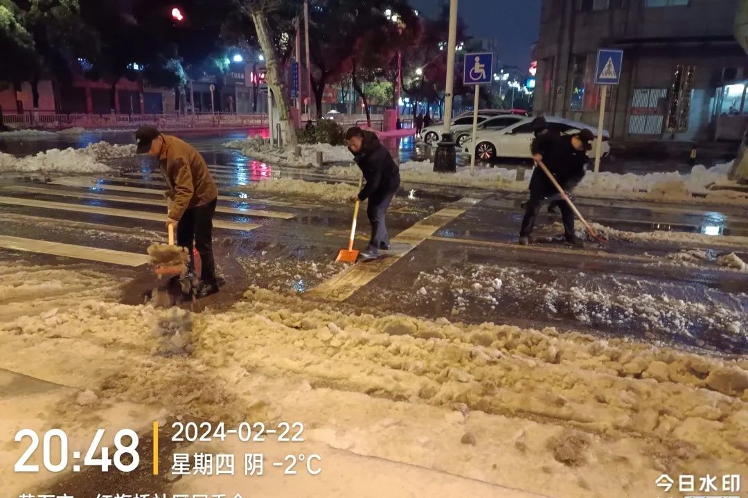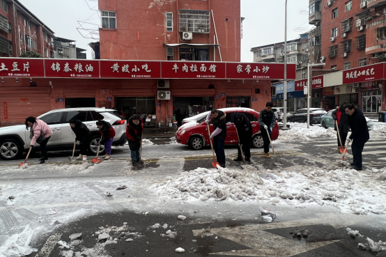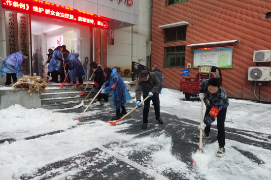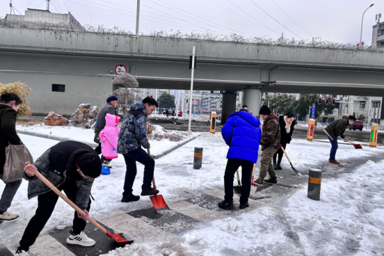 街道应急队伍对牛尾巴十字路口铲冰除雪。